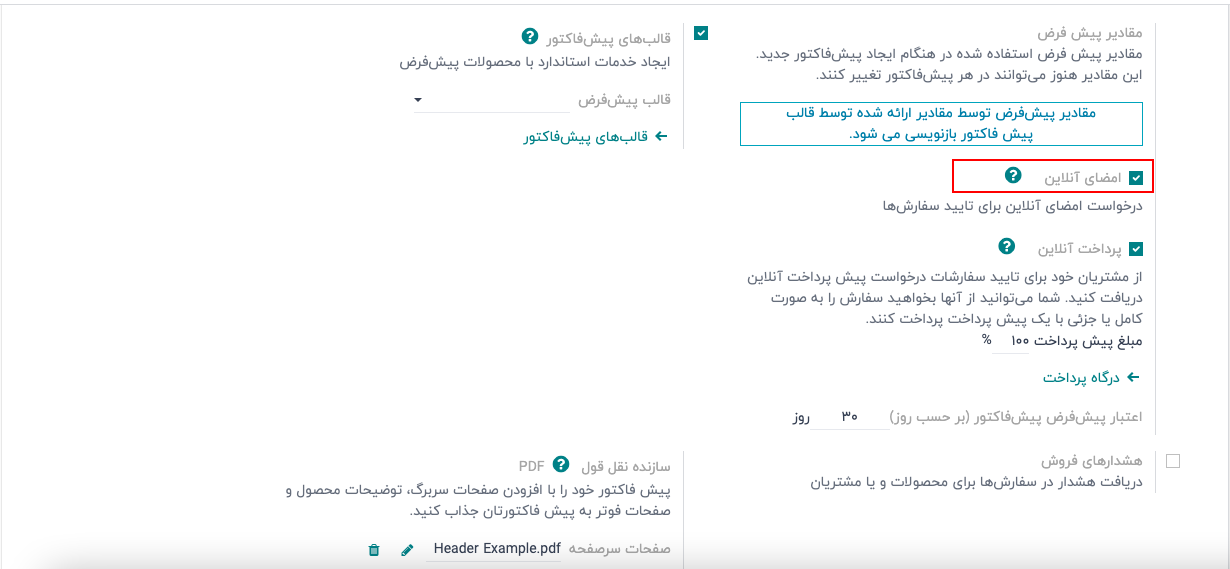 برای اینکه مشتریان بتوانند سفارشها را با امضای آنلاین تأیید کنند، باید ویژگی امضای آنلاین فعال شود.