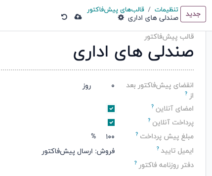 هنگامی که مشتریان از طریق پورتال مشتری به پیشفاکتورها بهصورت آنلاین دسترسی پیدا میکنند، دکمه امضا و پرداخت مستقیماً روی پیشفاکتور وجود دارد.
